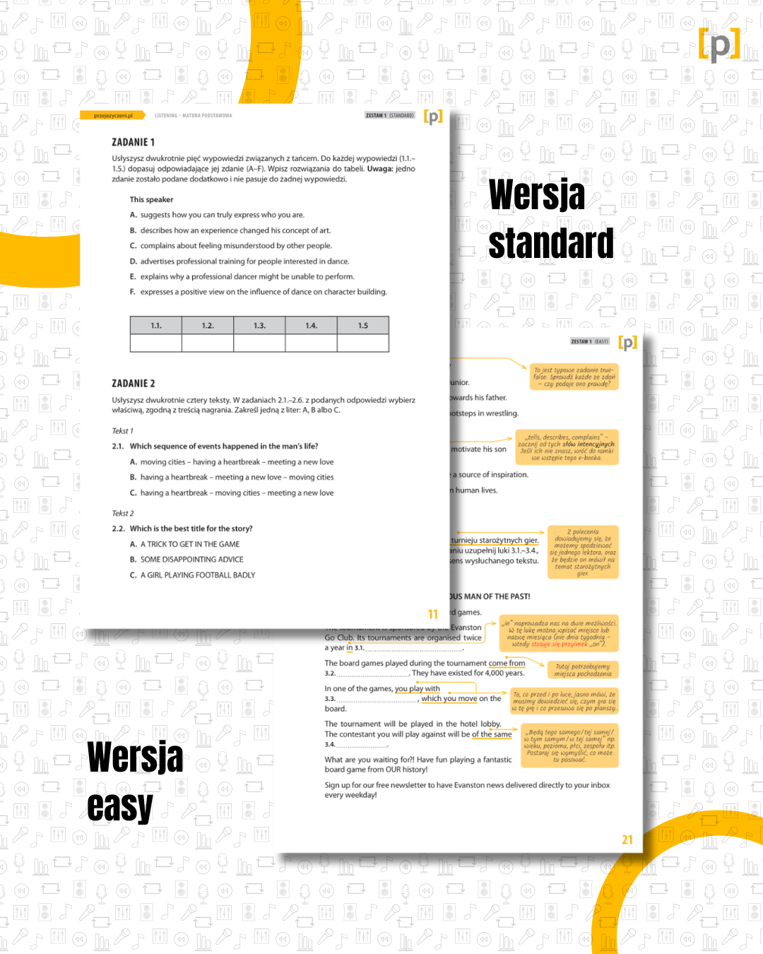 - Wersja Standard (arkusz i transkrypcja) i wersja Easy (wzbogacona o wyjaśnienia i podpowiedzi)