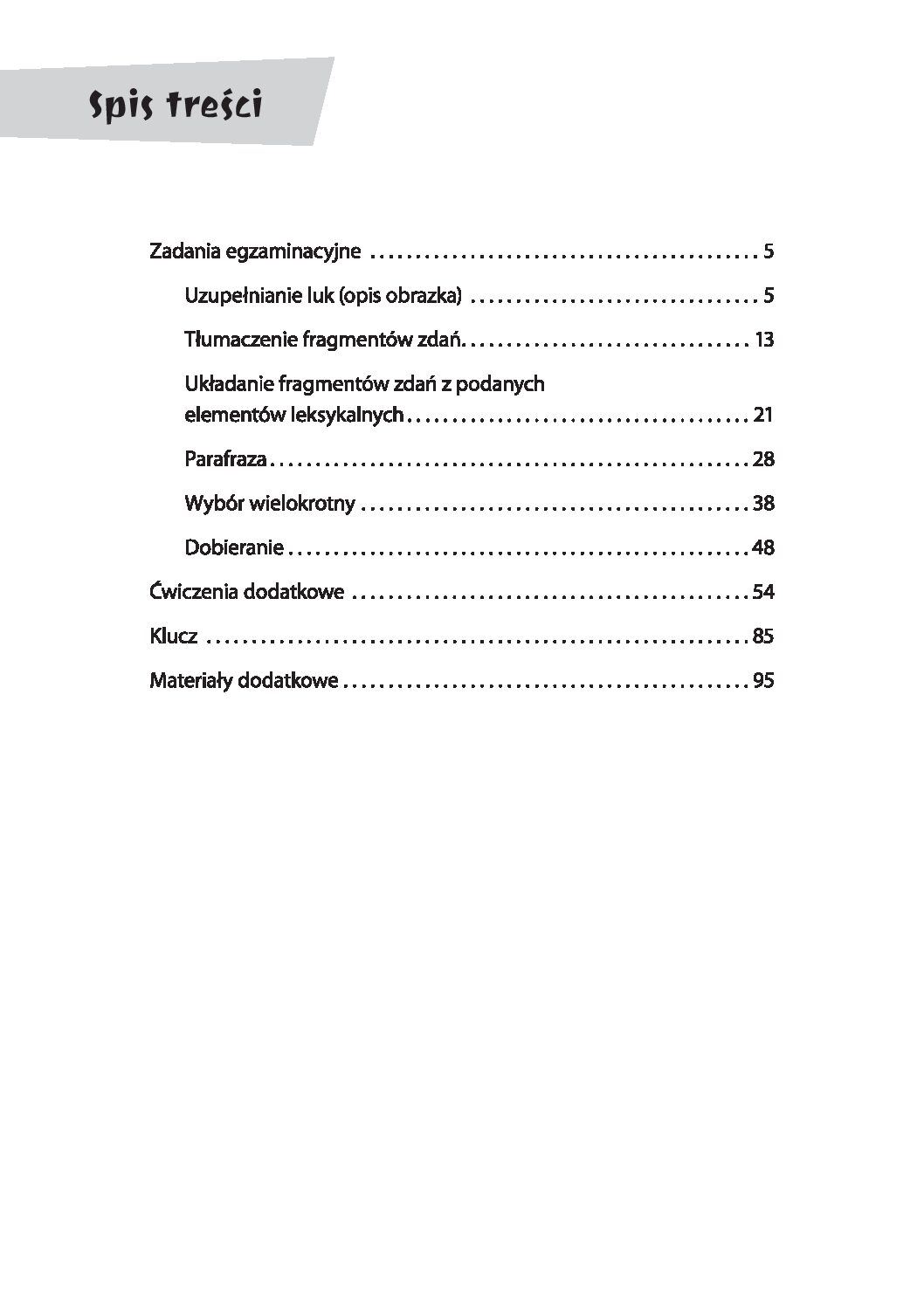 Świetny zbiór zadań do ćwiczenia środków językowych! Bardzo podoba mi się, że przed każdym typem zadania jest wyjaśnienie zadania egzaminacyjnego a później mamy mnóstwo przykładów na przećwiczenie danego rodzaju zadania.